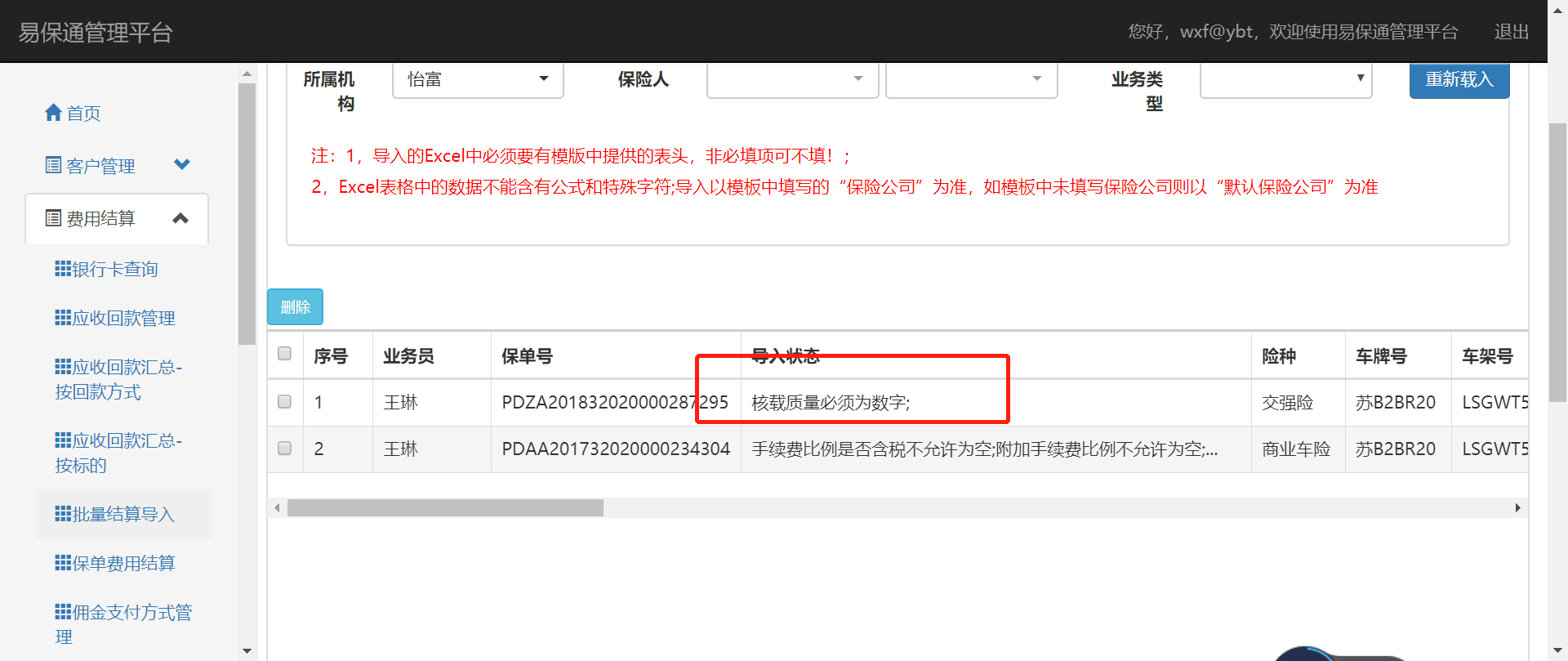 【速成高级版-批量导入】机构怡富:导入车险保单,核载质量没填,载入后提示核载质量必须为数字