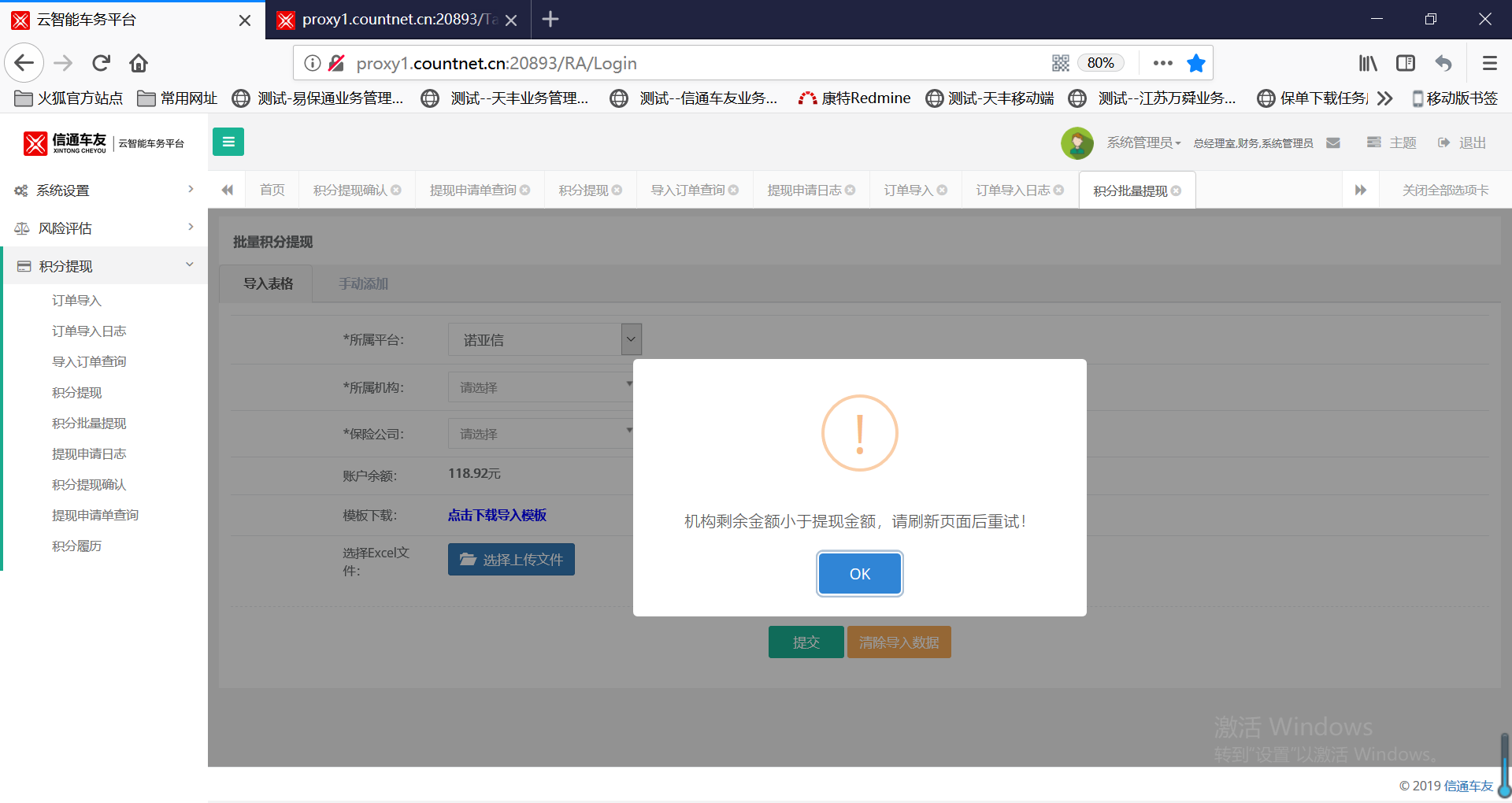 1. 当所有信息都填好后,更改了平台,但是机构和保险品牌为空,点击提交会如图提示,并清空了提现数据