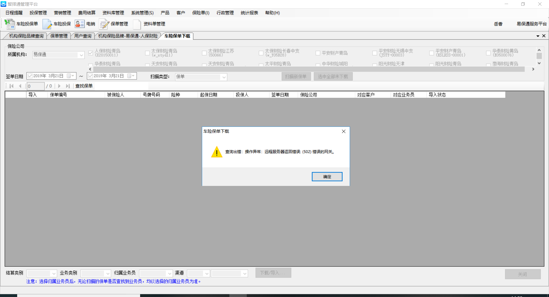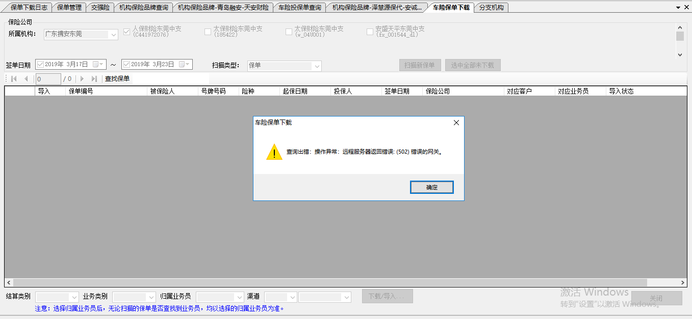 内容:携安东莞人保,在扫描保单时系统提示502,如图1,