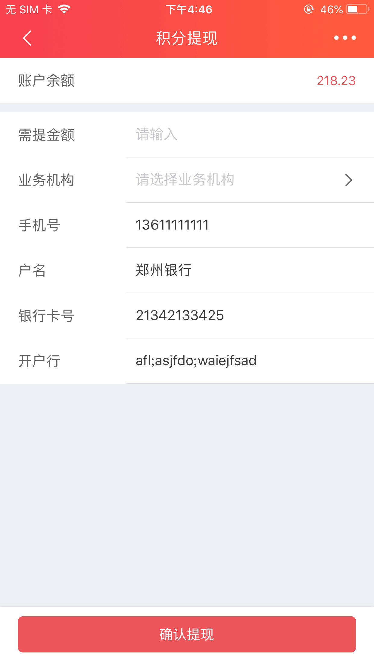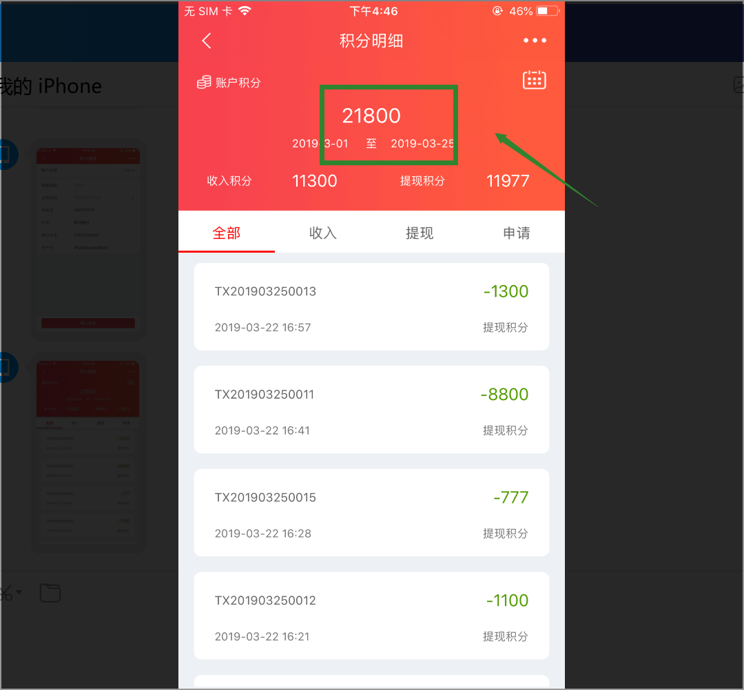 积分提现中显示的余额正确,提现单中显示的账户积分不正确,见附图