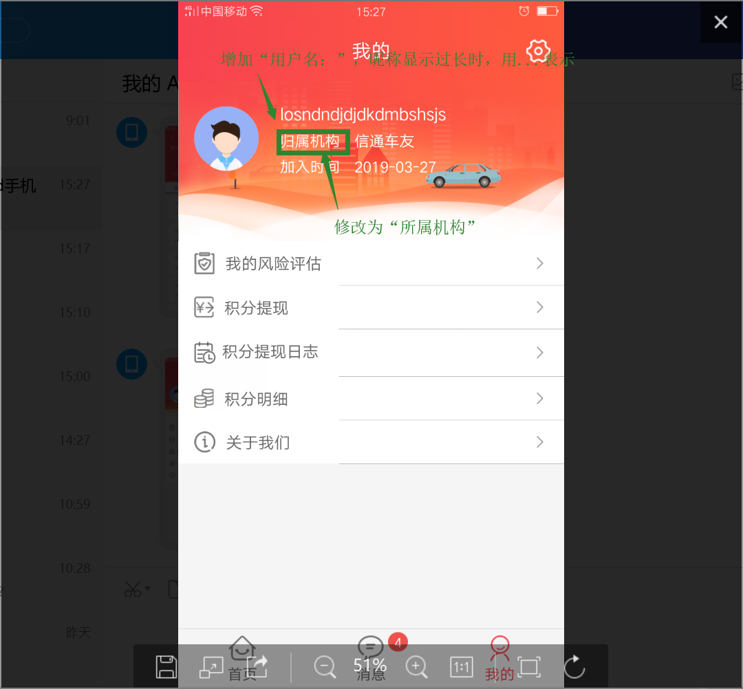 4. 我的:昵称前增加“用户名:”,昵称过长时后边用...显示。归属机构修改为“所属机构”