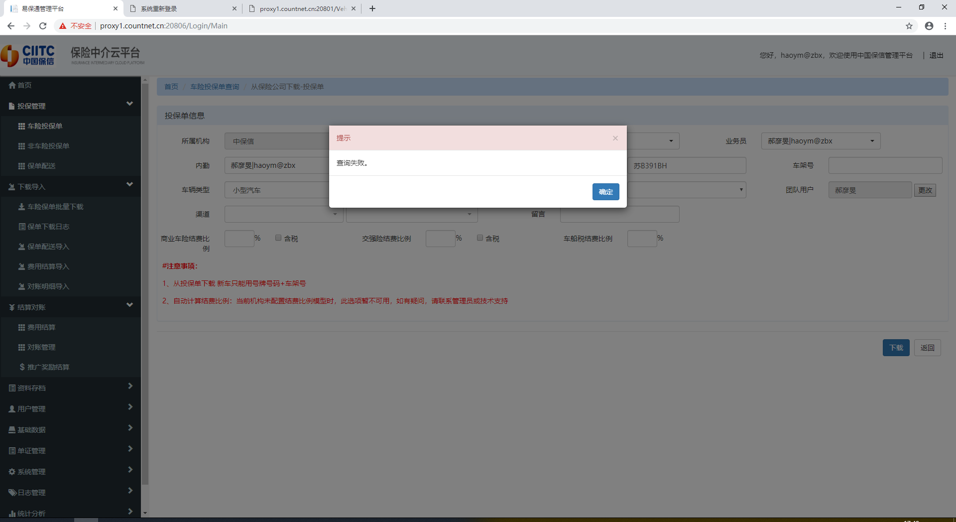 【中保信】投保单管理,从保险公司下载投保单,查询到有投保单,下载时提示查询失败苏B391BH