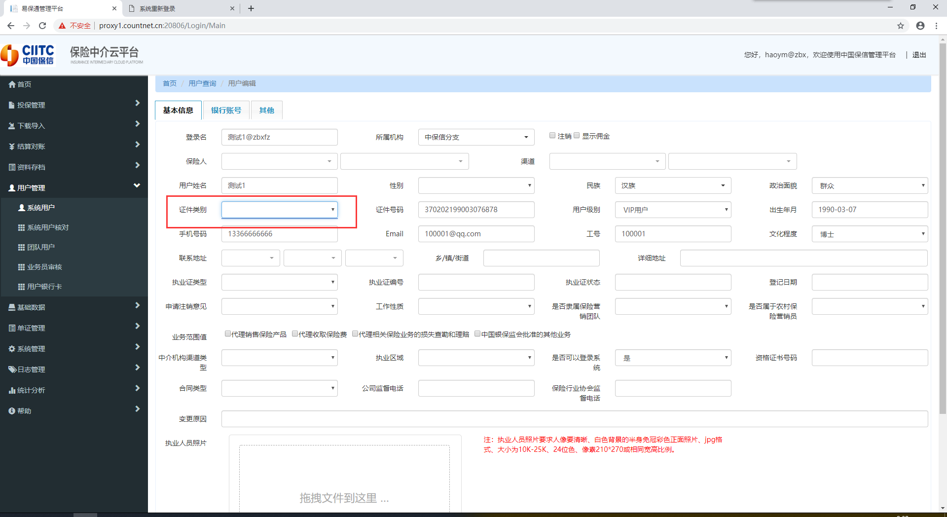 【中保信】用户管理,编辑子机构用户时,证件类别不能选择