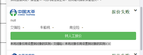 用车牌号【苏B212W6】在盐城市荣泰保险代理有限公司【中国太平】报价失败,提示错误:未将对象引用设置到对象的实例。交强险:未将对象引用设置到对象的实例。。