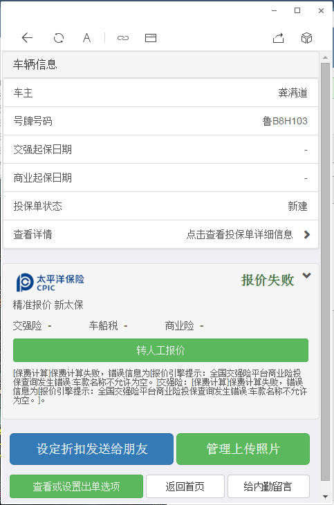 【安达】新太保报价时提示全国交强险平台商业险投保查询发生错误:车款名称不允许为空。