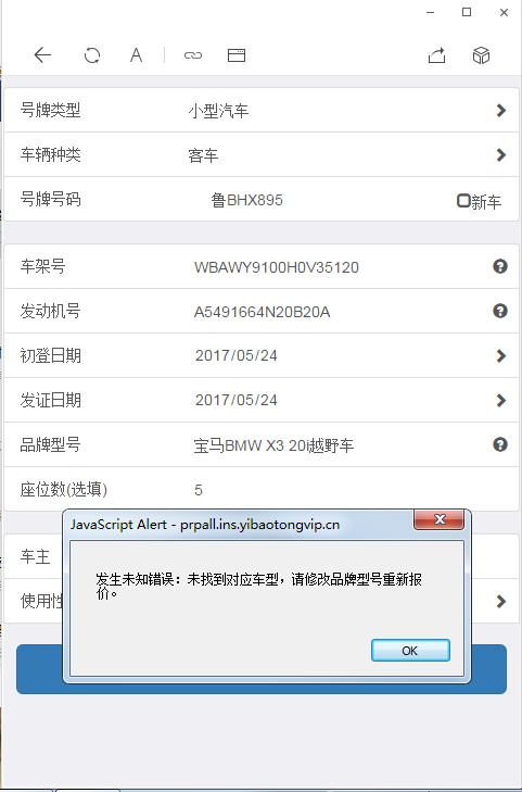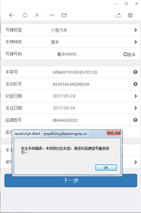 内容:报价时输入车型点击下一步提示发生未知异常,未找到相应车型,请修改品牌型号重新报价。使用保险公司自动带出的车辆型号依然无法进行报价。