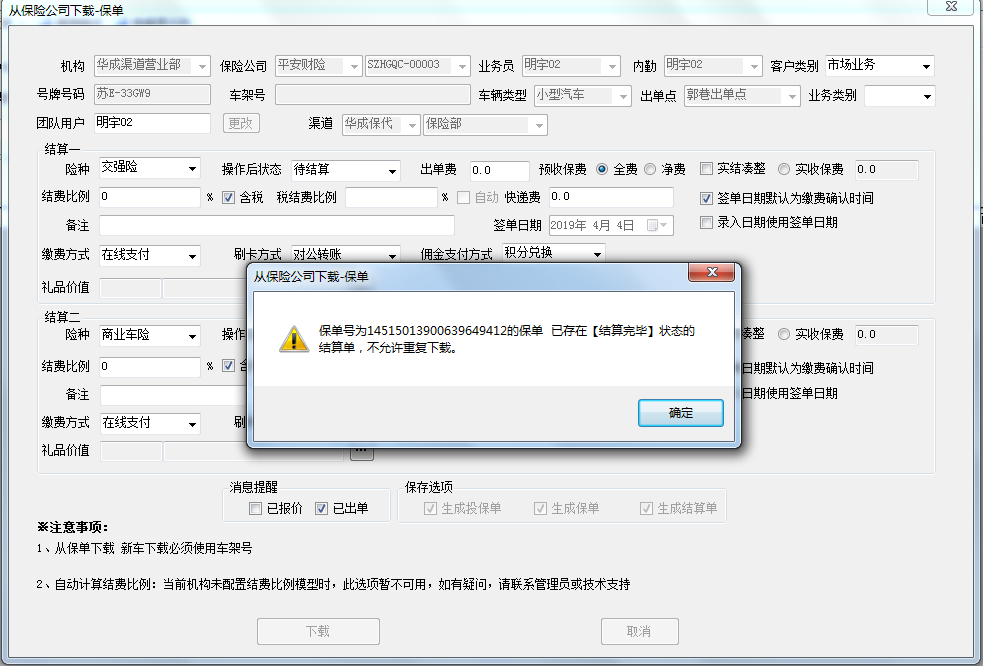 保险公司下载保单时存在先投保交强险,再投保商业险。或者先商业再交强 的情况,在此情况下,如果先下载了其中一个险种例如交强险,后期客户再投保商业险时,就会存在无法下载商业险的情况,提示已存在交强险保单号的相关结算单,无法进行下载,请修改为及时下载了交强险也允许下载商业险,反之亦然。