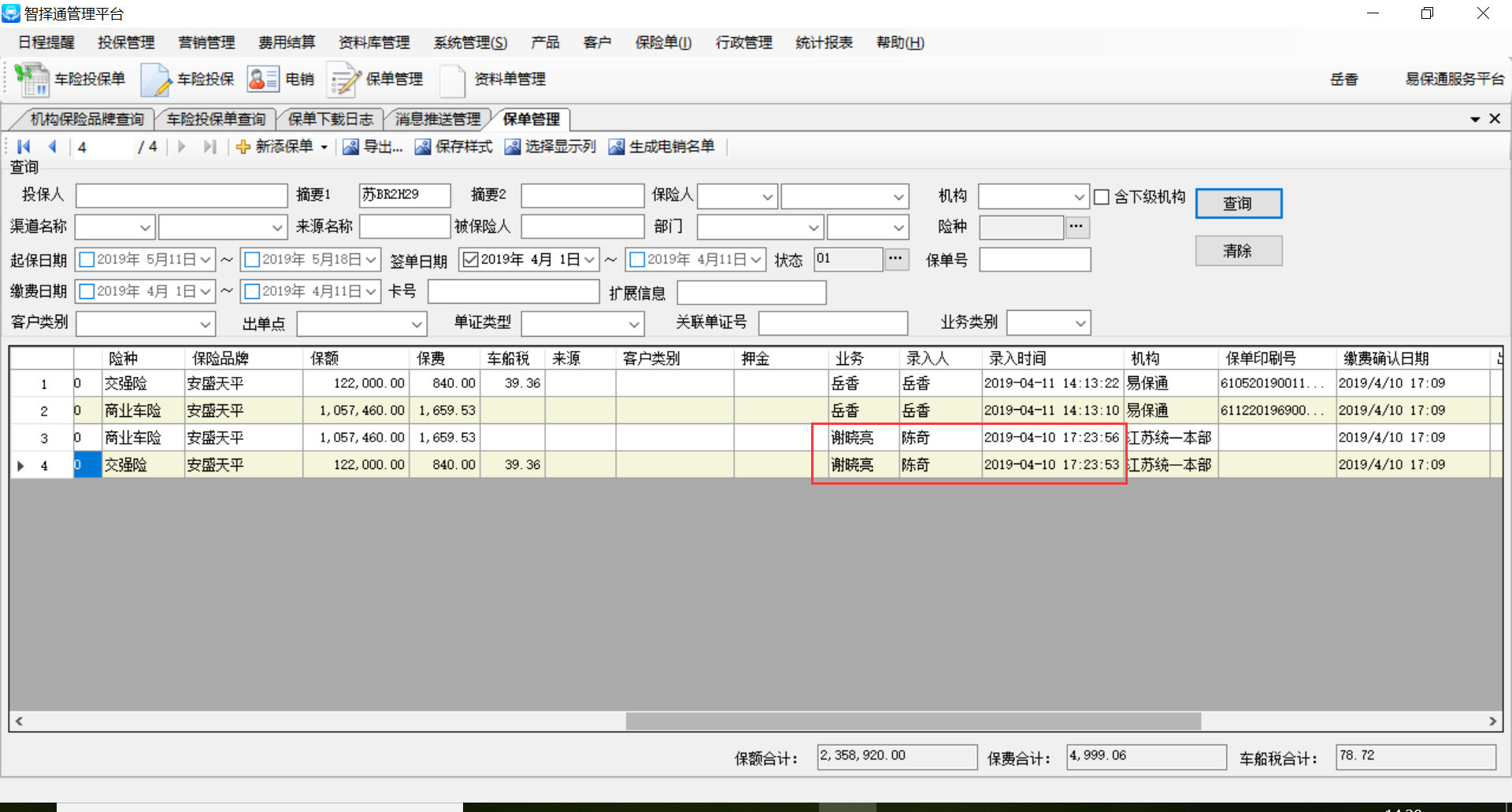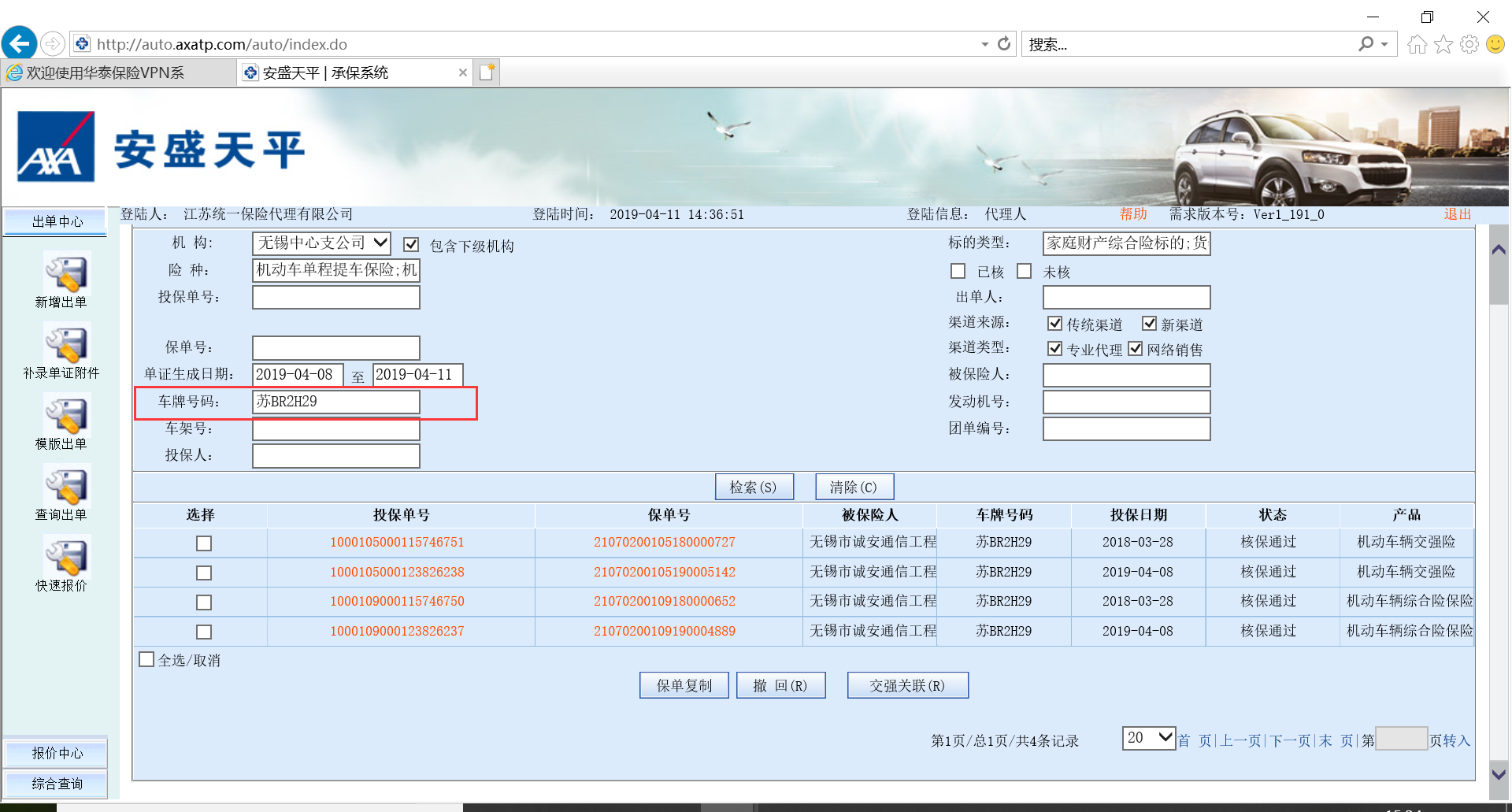 上述车在保险公司系统的【查询出单】菜单项中共计能够查询到四条投保单数据,如图“苏BR2H29综合查询”,但是使用统保系统测试下载的过程中系统只能显示出两条投保单数据,导致客户无法下载指定投保单数据。