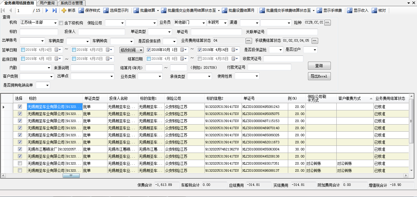 内容:查询条件:江苏统一本部 修改时间2018-10-01至2019-4-14 险种:除交强商业和健康险以外所有险种,结算状态为:04|已核准详情见附件