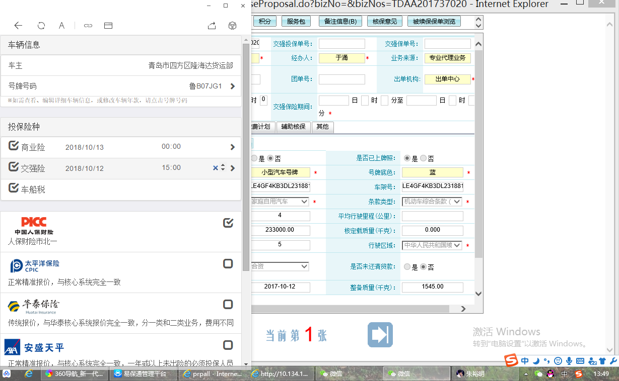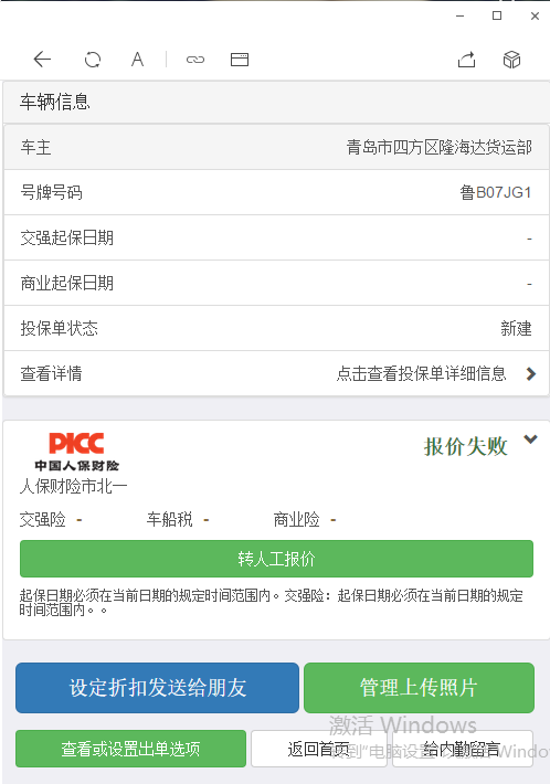 例如车辆:鲁B07JG1 (2018.10.12.下午15时)青岛地区只能提前30天报价,今天是9.12号下午13点,,而这辆车的起保日期是在10.12下午15点,报价时系统是会提示起保日期不在规定的范围.