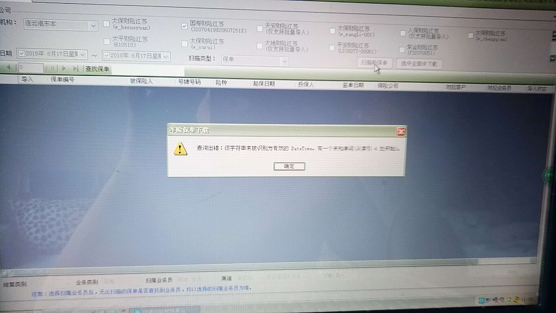 国寿扫描保单时提示“查询出错:该字符串未被识别为有效的DateTime.有一个位置单词(从索引4处开始)”