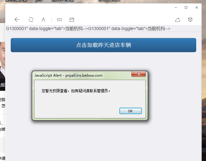 登录保尔微信公众号-》保险商城-》进店车辆,进入后会提示“无权限” 同时在头部会展示出代码,具体内容间截图。