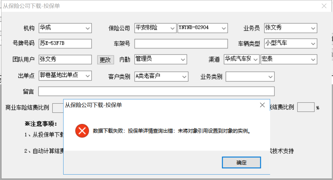 【苏州华成】投保管理-车险投保单查询,新建-从保险公司下载平安保单系统提示“为将对象引用设置到对象的实例”