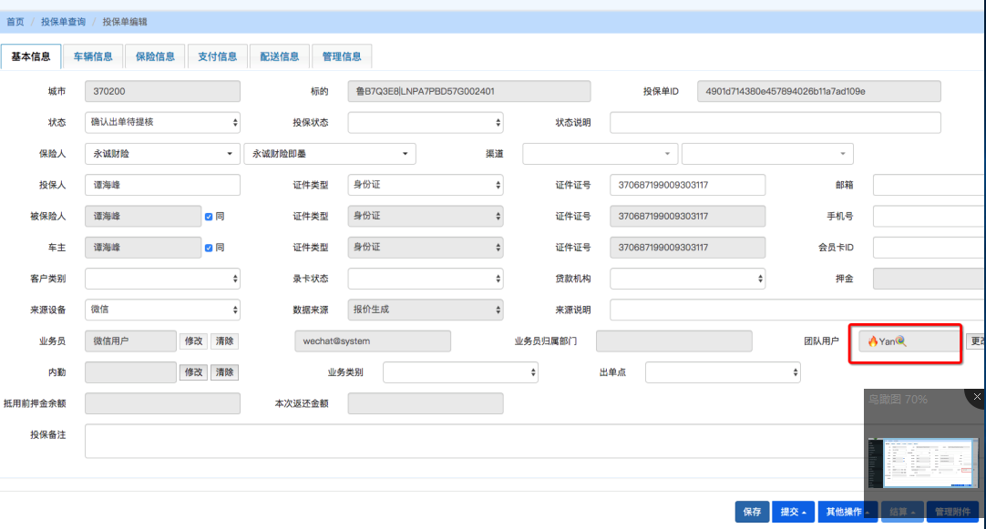 投保单中的团队用户修改后进行保存,还是修改前的团队用户,具体详情请见附件图片。