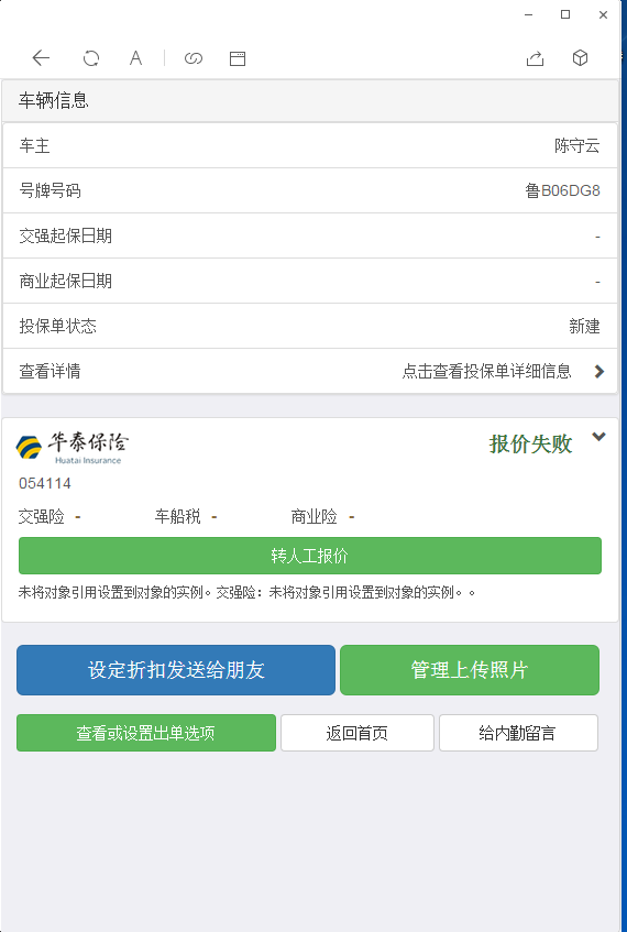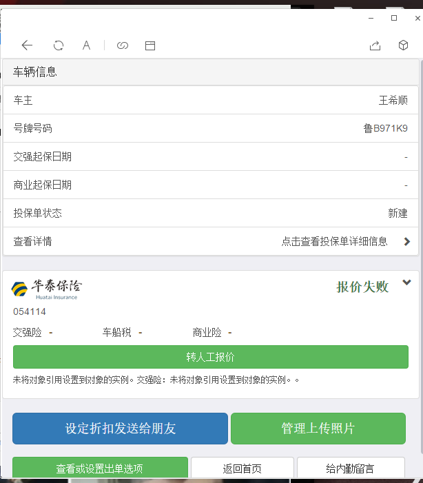 提出人:王琪琦关键信息:车牌号鲁B971K9、鲁B06DG8 账号054114密码AAaa123456描述:鲁B971K9、鲁B06DG8在【安达保】华泰报价时会提示未将对象引用到实例。