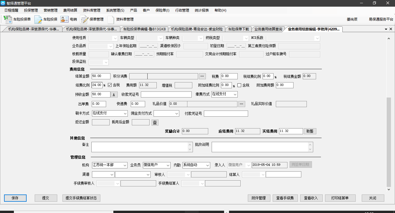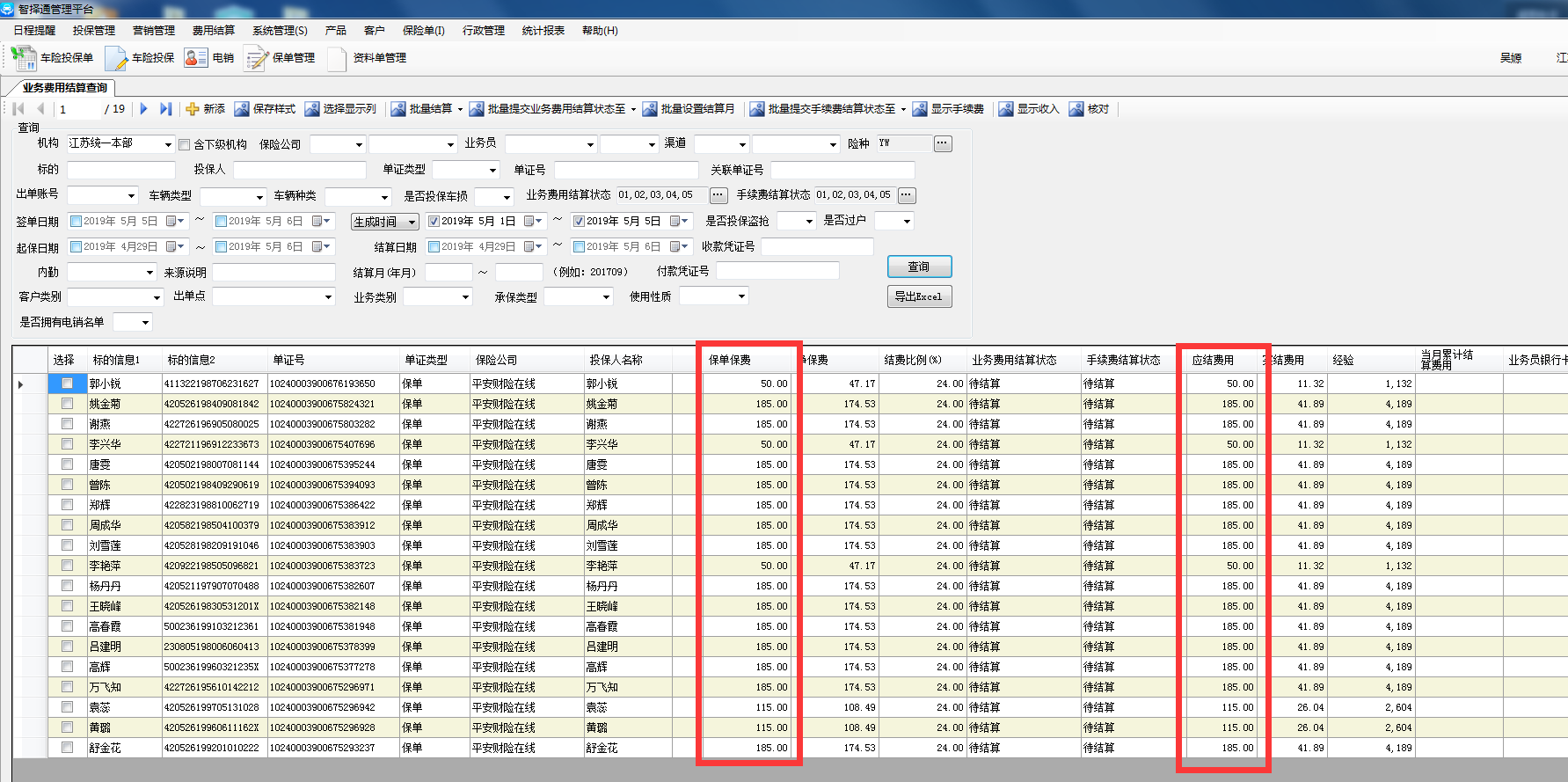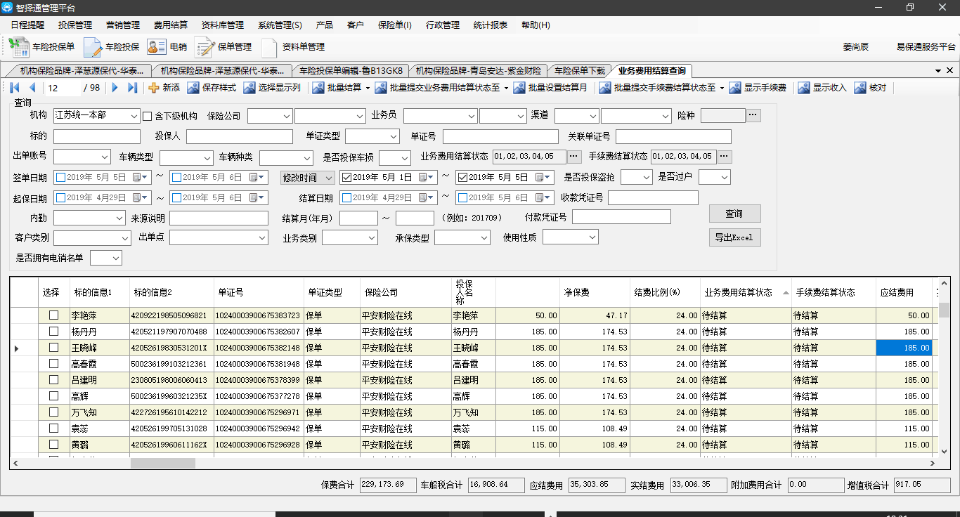 提出人:吴媛详细信息:账号jiangshangchen@ybt密码123456描述:结算单查询出保费和应结费用一致。