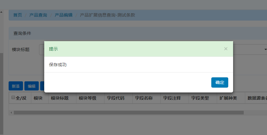 描述:编辑--产品扩展信息 新添测试条款,只输入模块,模块标题也会提示保存成功(没有判断空值),查询列表中无数据