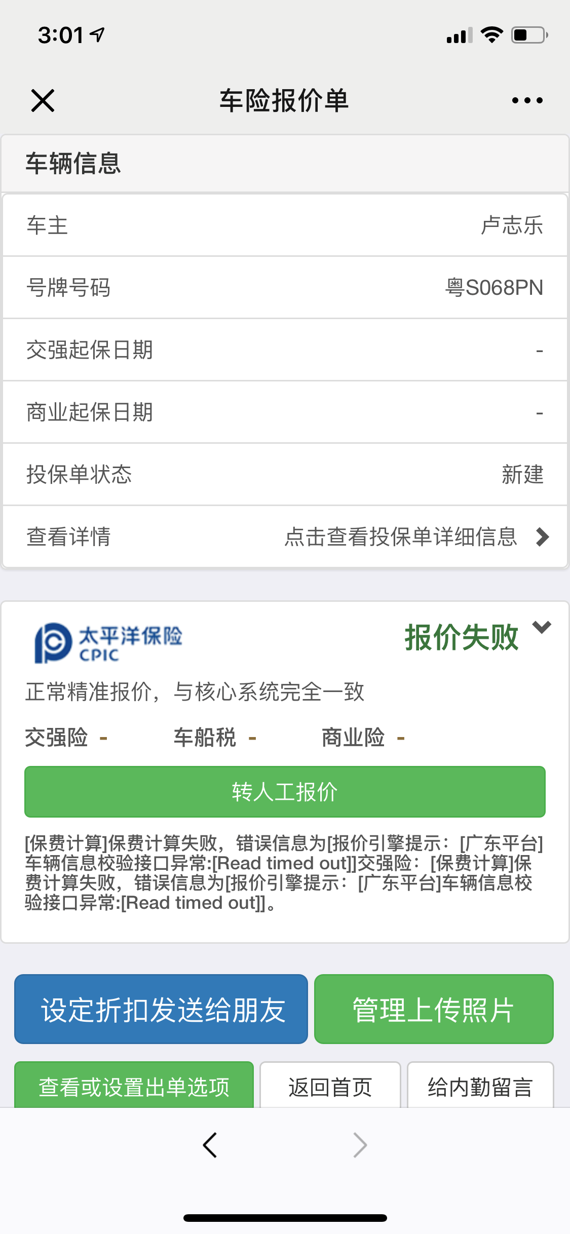 描述:用粤S068PN在广东飞腾公众号报价错误,提示read timed out.