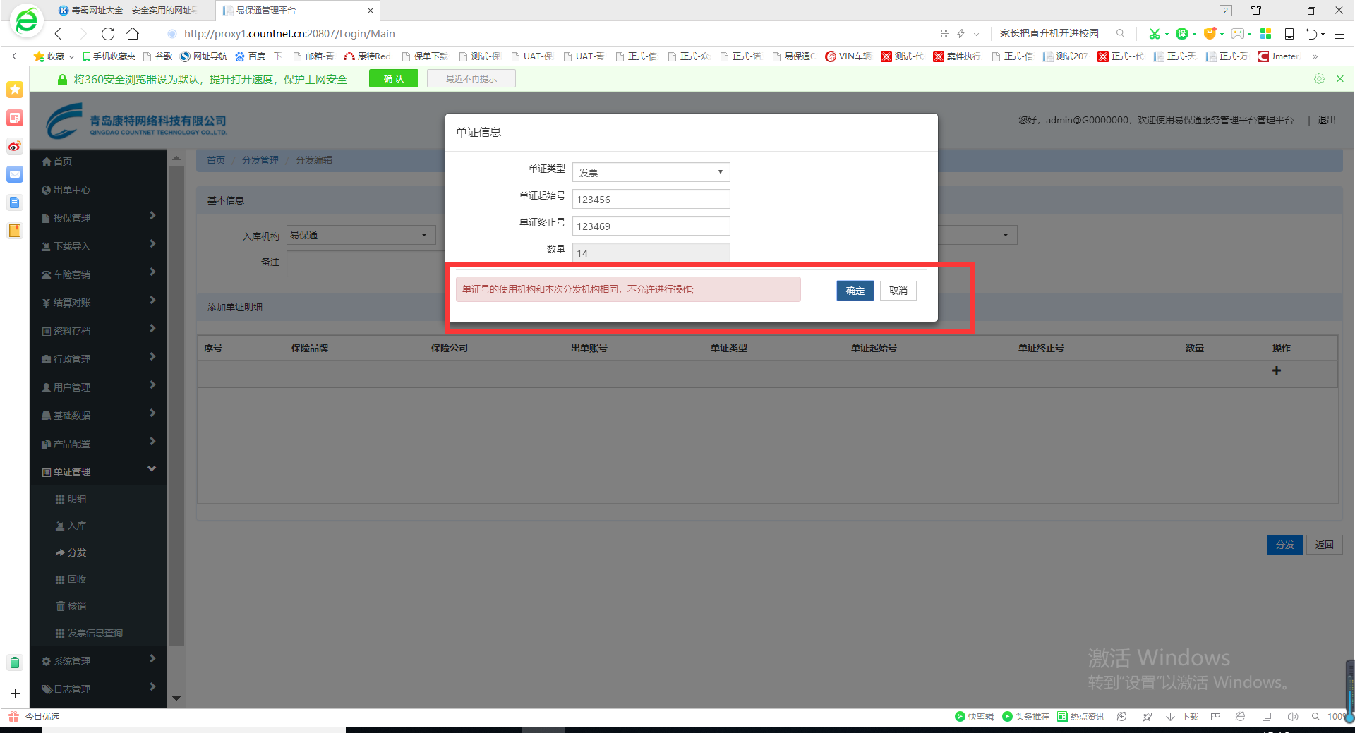 【单证管理】分发->添加明细时,单证号与之前添加的重复了,提示信息有误,见图