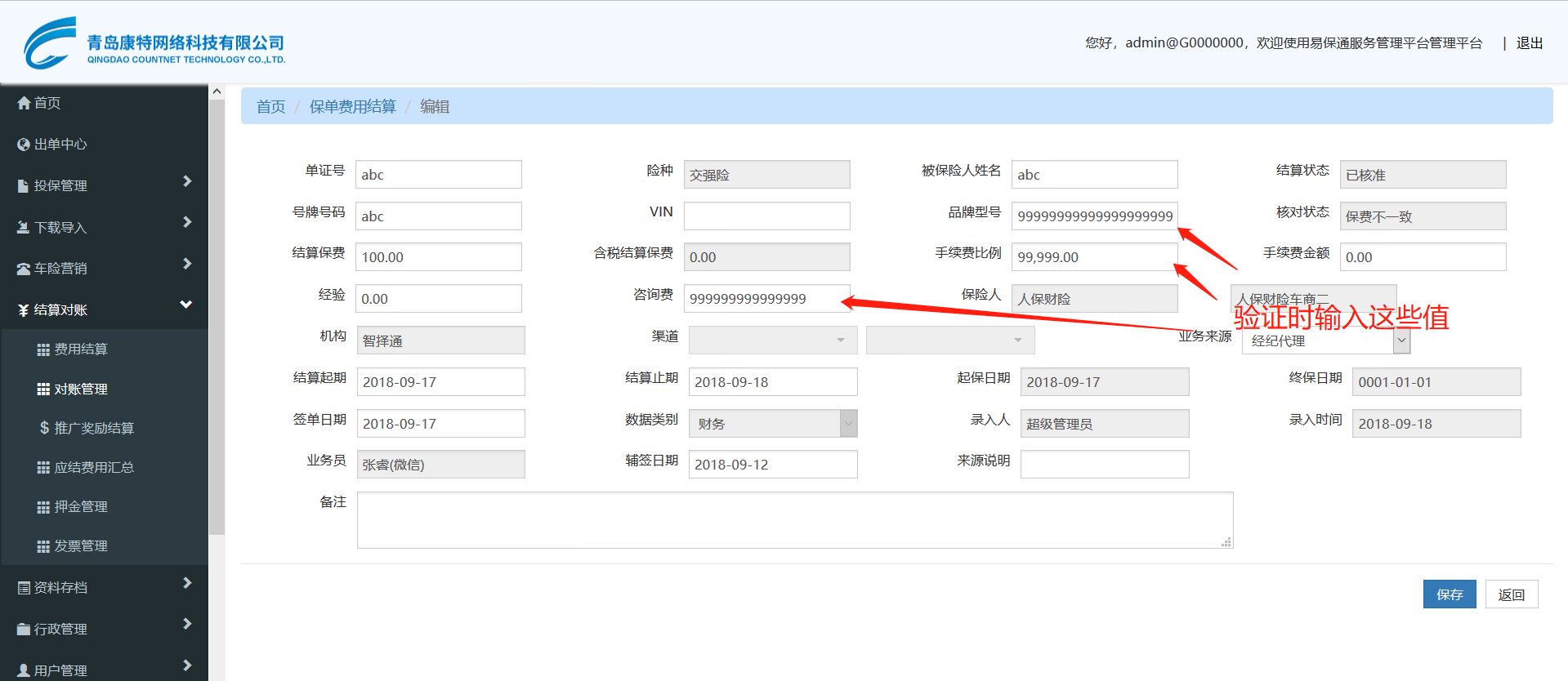 【易保通】结算对账。对账管理编辑页面"品牌型号"/"手续费比例"/"咨询费"输入字数到最大,保存不上也无提示【提出人:王晓峰】