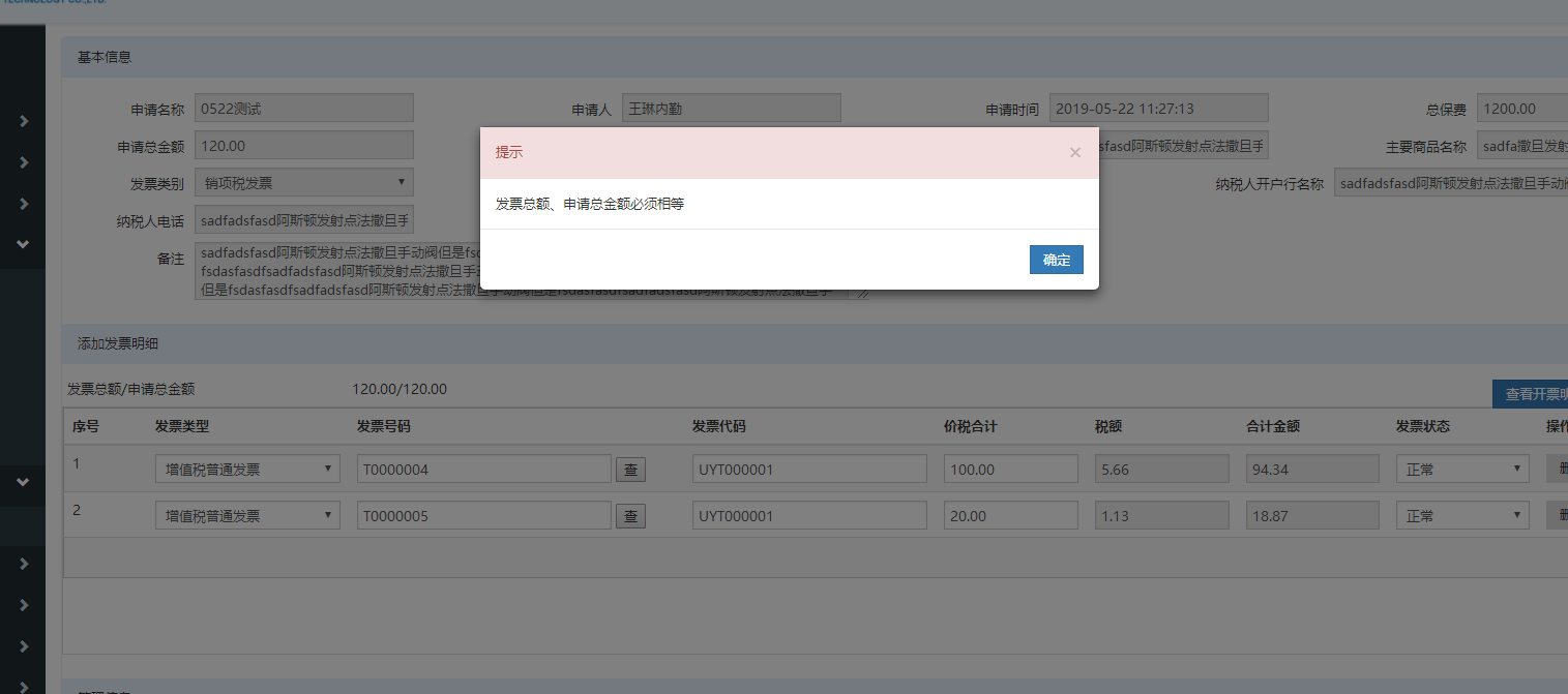 经测试,发票总额和申请总金额相等也无法提交,见图