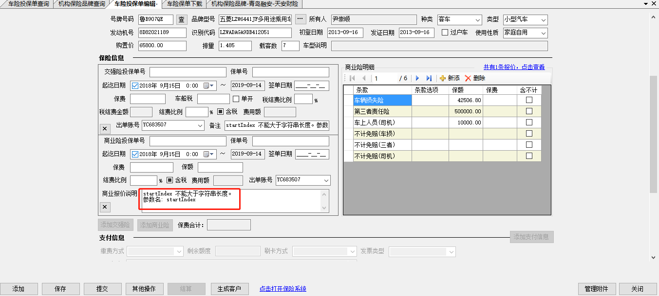 在系统内报价失败,提示startIndex 不能大于字符串长度。参数名: startIndex