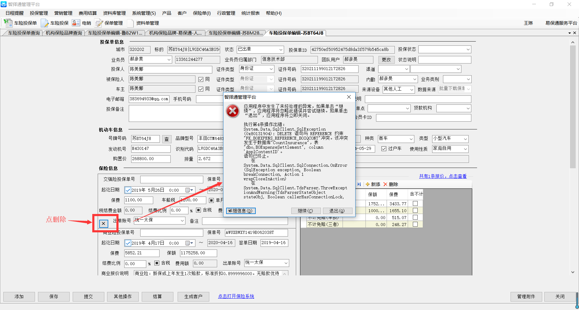 【正式环境】打开已出单的投保单,删除保险信息时报错,见图