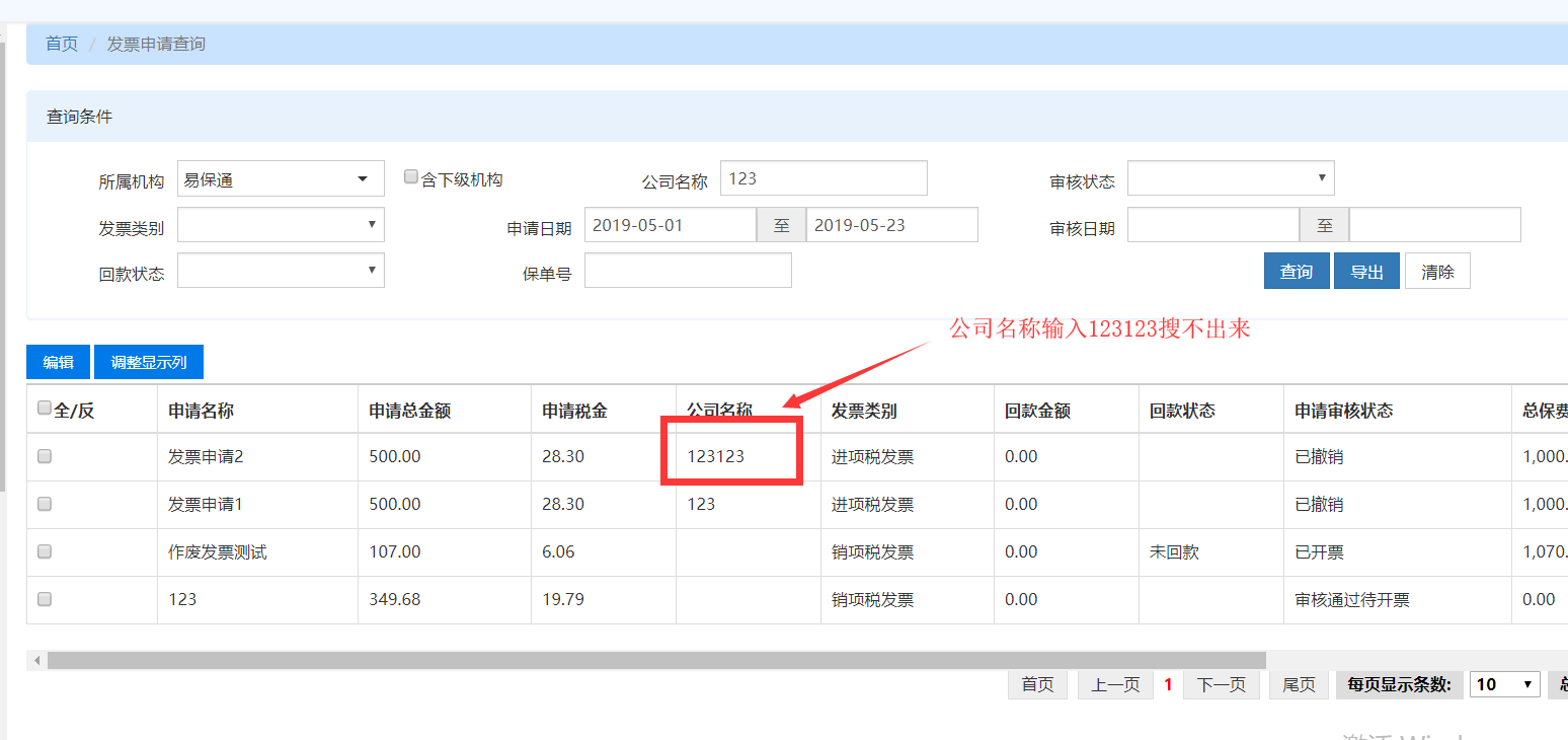 1. 见图中,公司名称输入123123,搜不出对应数据2. 公司名称输入123,搜出来的数据也不对