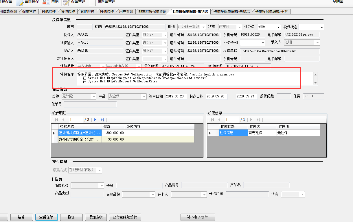 提出人:姜尚辰详细信息:平安描述:客户投保了一下平安的——安全保,在统保上面直接投保的,但是进后台看了说投保异常,查看保单,也查不到,麻烦看一下