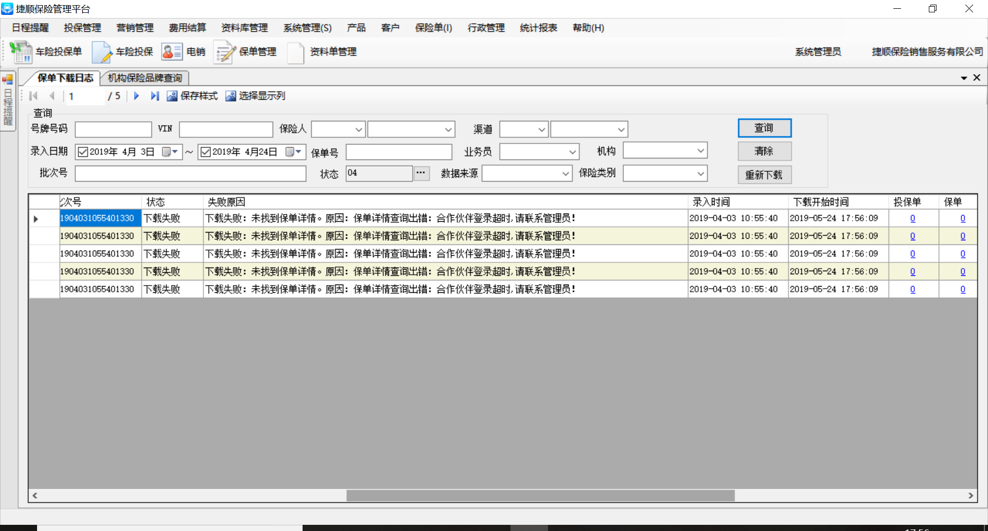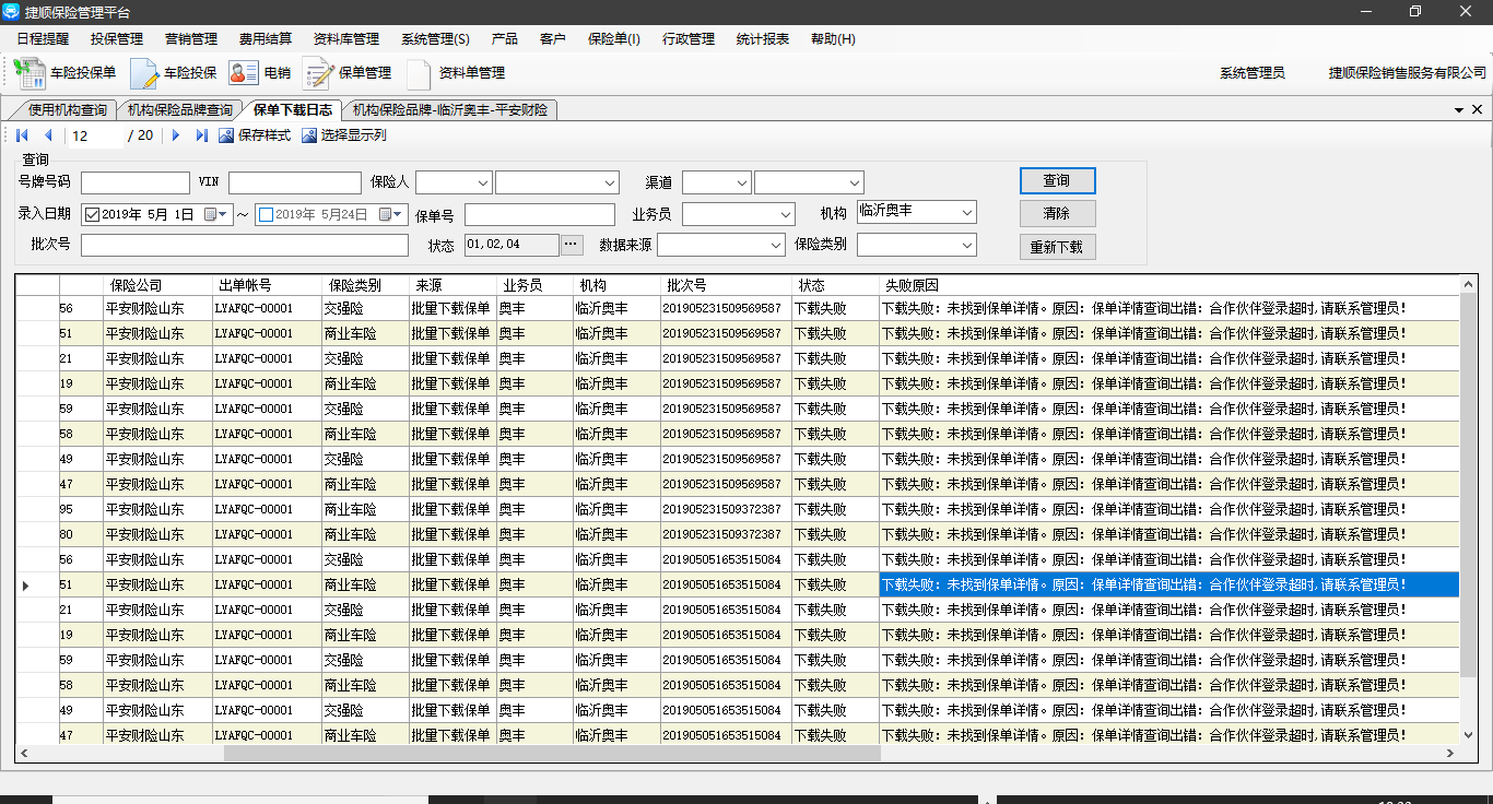 描述:保单日志里面重新下载提示合作伙伴登录超时,保持登陆在线,加代理也可以登上保险公司,重试多次仍然报错。