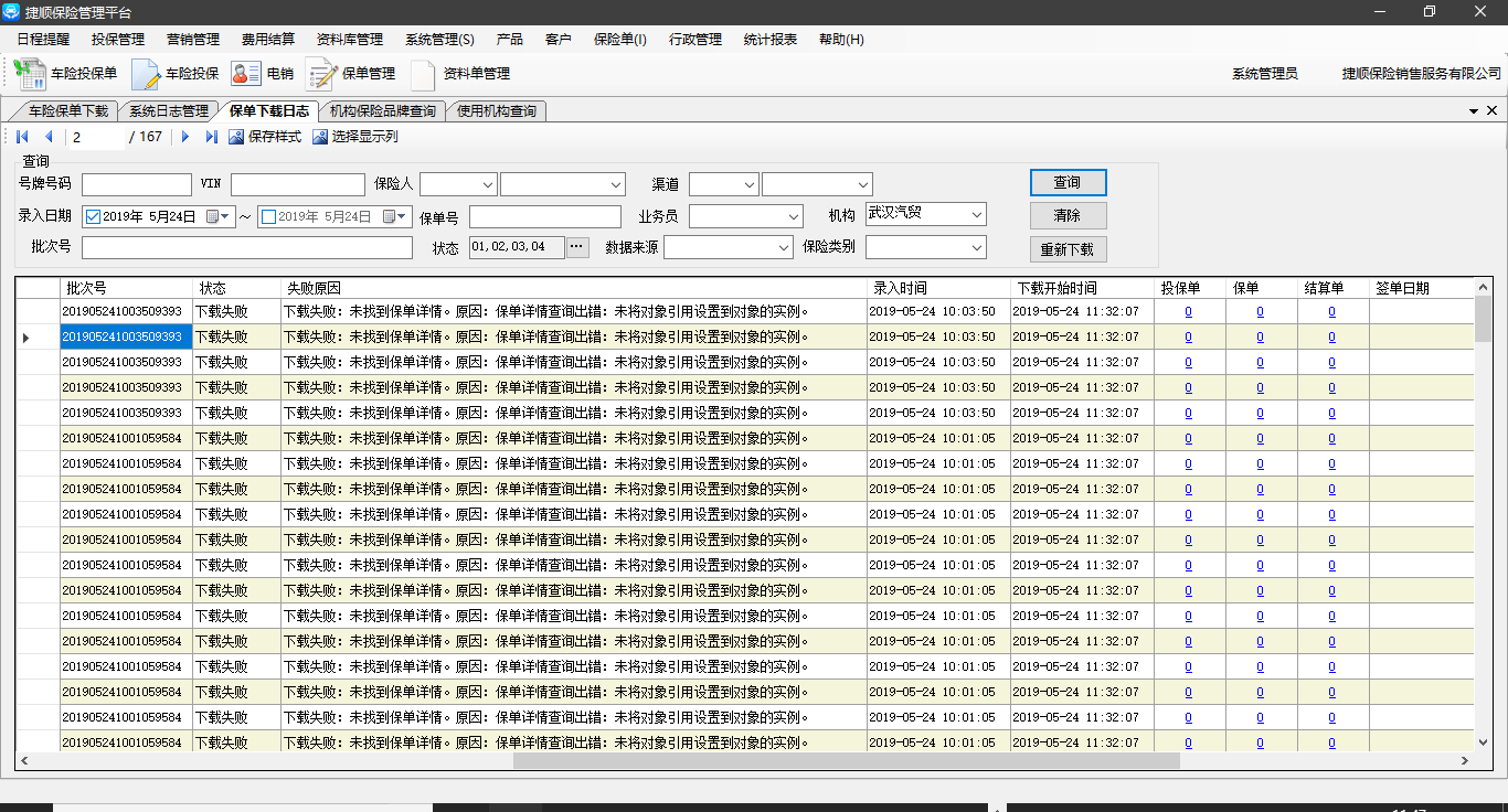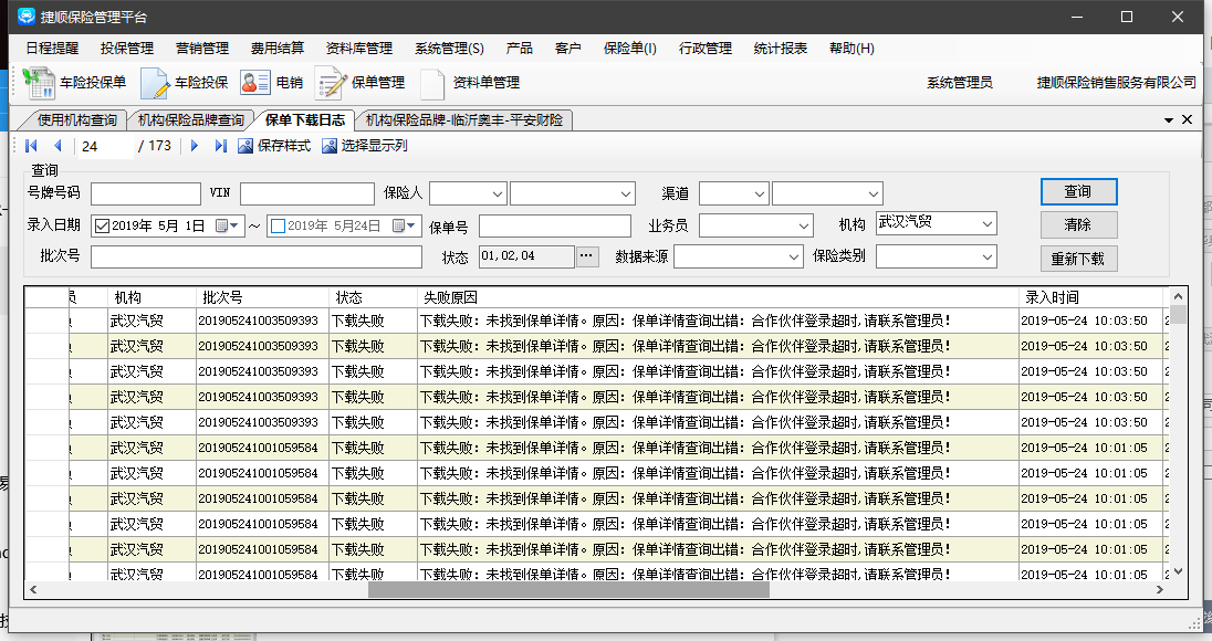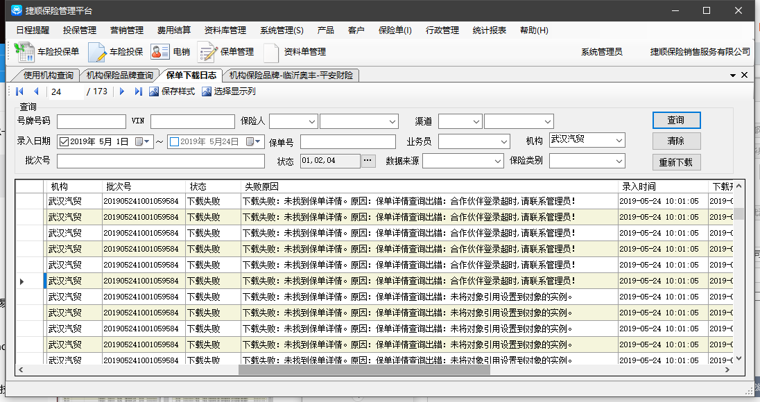 描述:捷顺保单下载不下来,提示合作伙伴登录超时,通过代理可以访问保险公司,保持登陆也没问题但就是下载不了,武汉汽贸之前下载保单提示未将对象引用到实例,刚刚我试提示合作伙伴登录超时。
