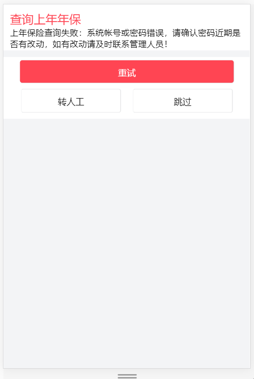 备注:原因为保险公司的账号密码不符/异常(图1)。希望开发在公众号系统内能加入报错提示的优化。