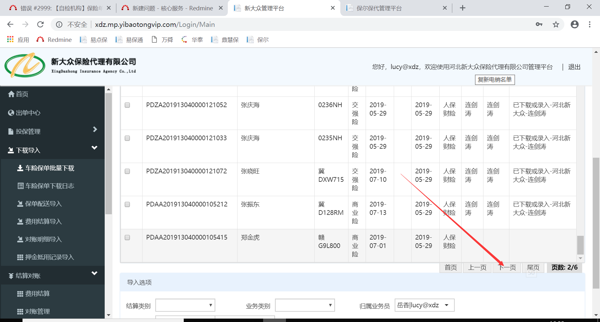 描述:扫描出保单后系统显示一共有6页保单数据,点击下一步时系统显示空白。