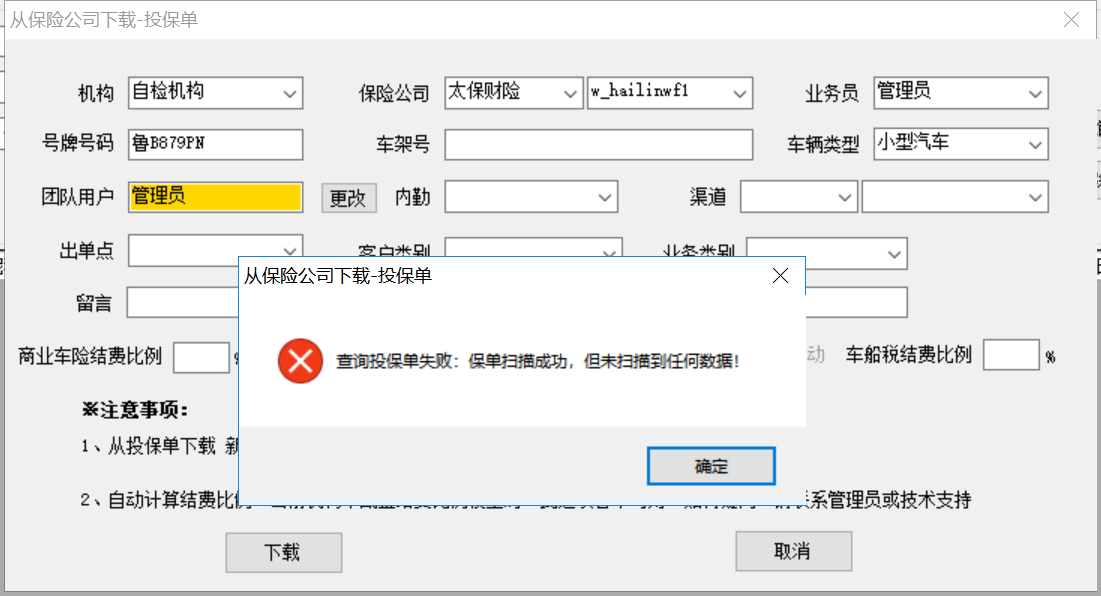 描述:上述车在该出单账号内能够查询到投保单数据,使用智择通系统下载时提示“未扫描到任何数据”。