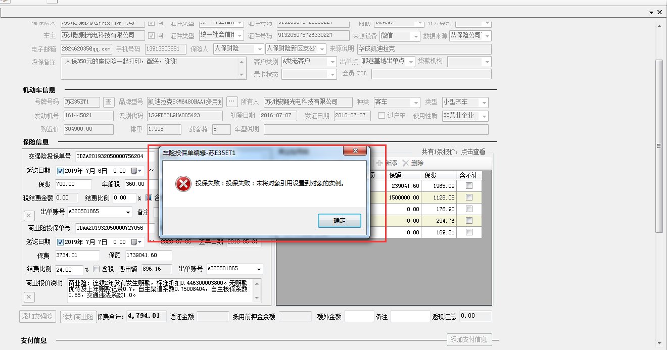 投保人保任我行时提示“投保失败:未将对象引用设置到对象实例”