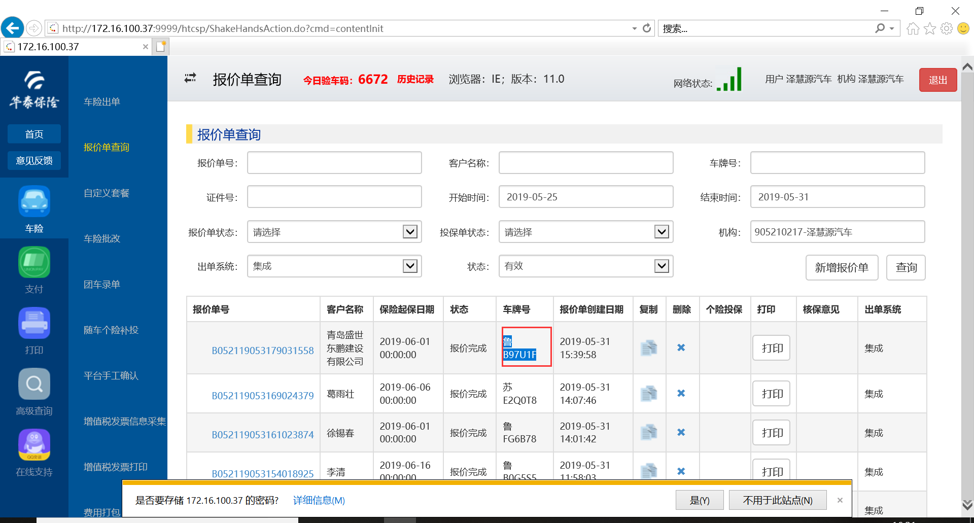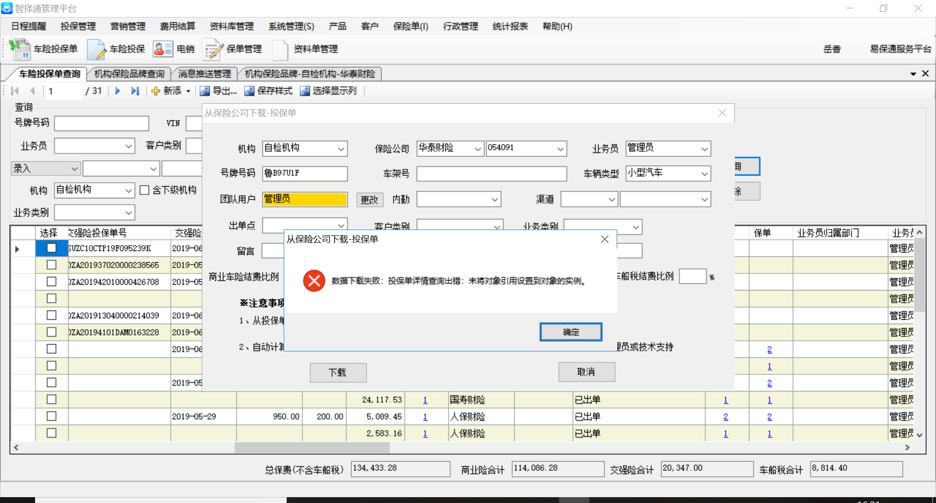 描述:上述车在保险公司系统中能够查询到投保单数据,使用系统下载投保单系统提示“未将对象应用设置到对象的实例”