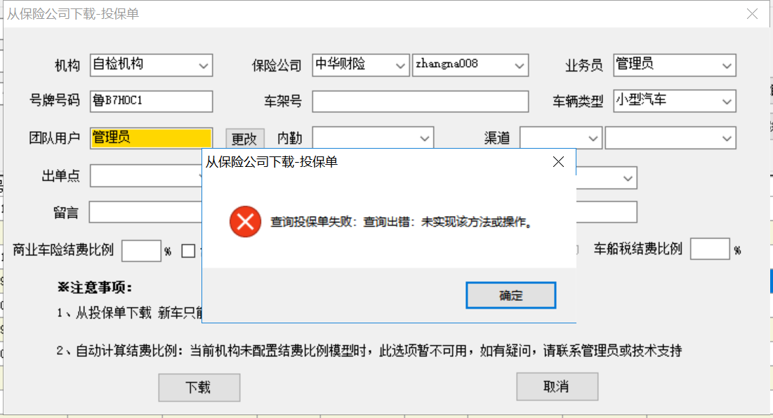 描述:上述车在自检机构下下载投保单时,系统提示“未实现该方法或操作”。