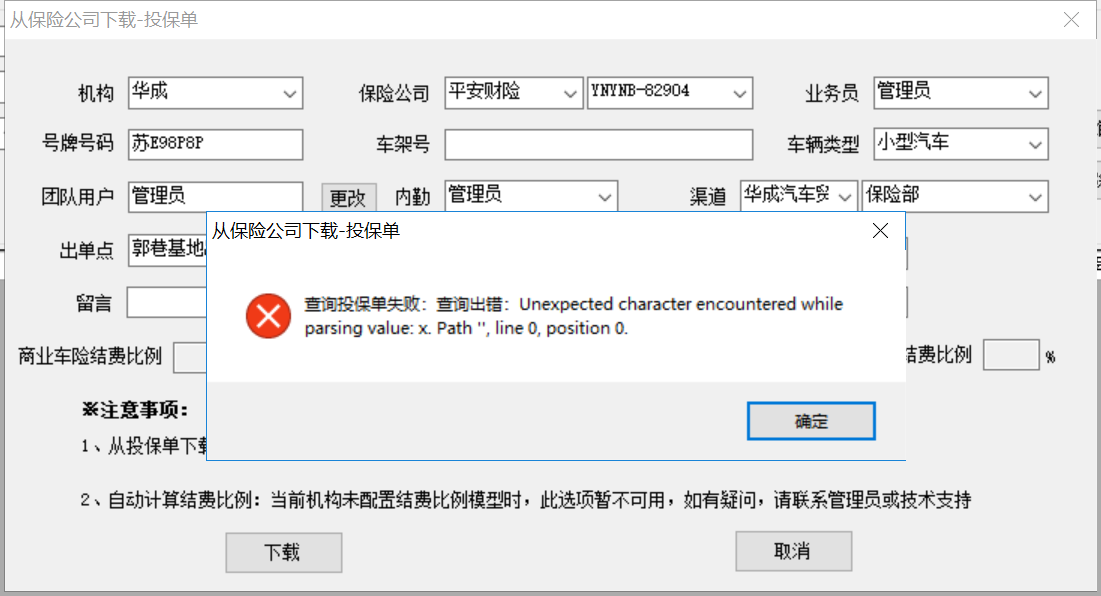 描述:上述车下载投保单时系统提示报错“Unexpected character encountered....”