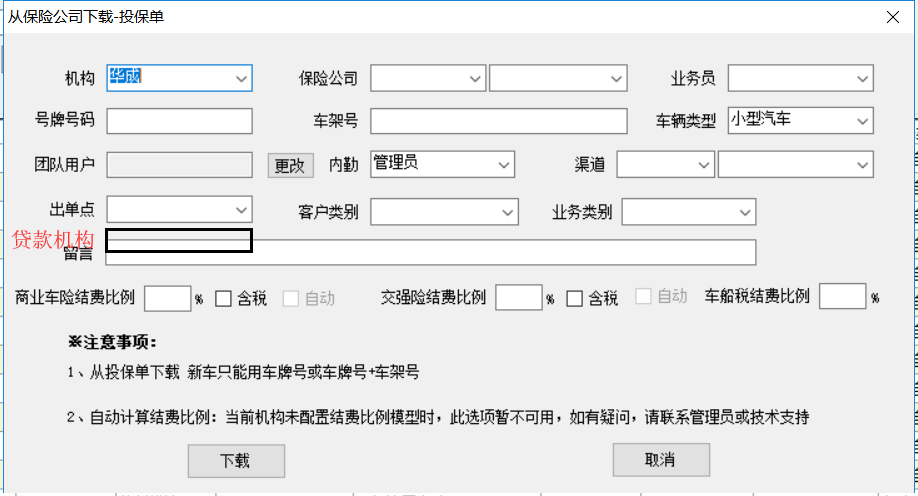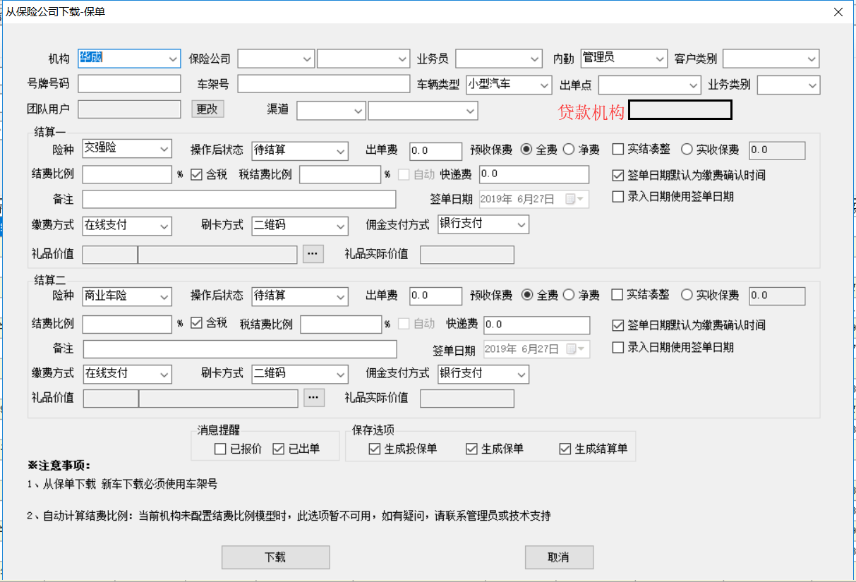 描述:从保险公司下载保单/投保单时能够选择贷款机构,请注意该选项不是必填项。