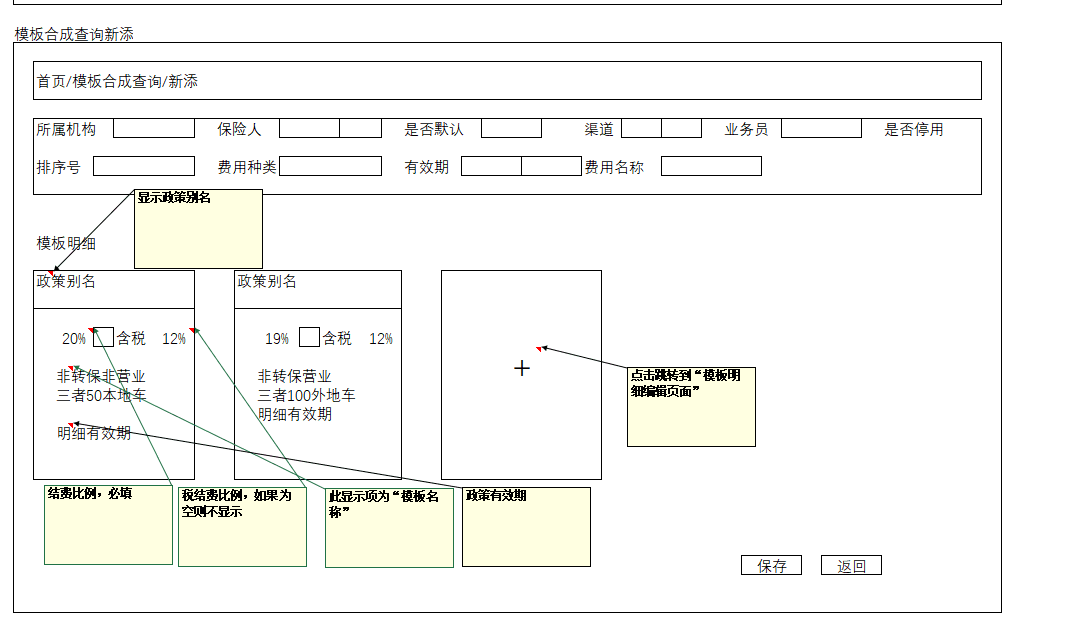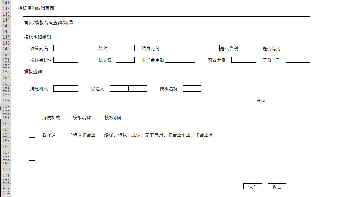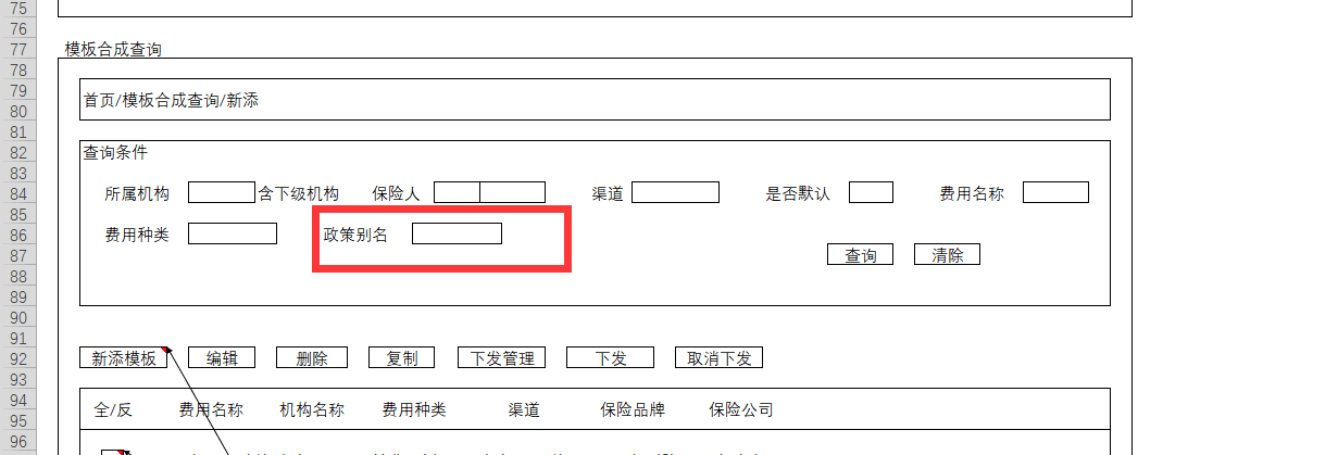 模板明细编辑页面中--模板查询--查询条件变更,去掉“所属机构”、“保险人”两个查询条件,取值方式从模板合成查询新添页面中所选择的所属机构中进行选择。