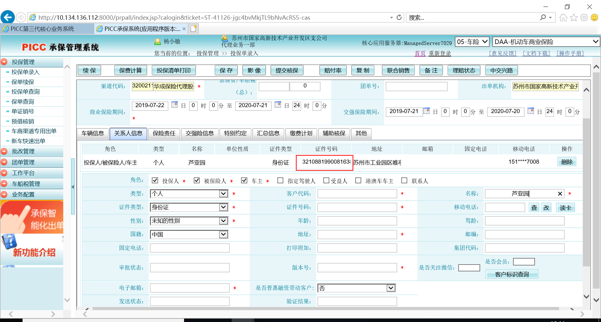 在保险公司系统内使用续保报价测试时,系统会将上年保单内的信息带入当前投保单内。并且名称以及证件号未加密。