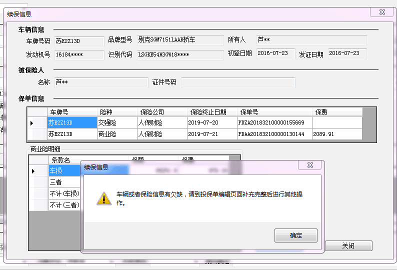【苏州华成】管理系统从续保查询获取到保险信息后点击下一步提示信息不全