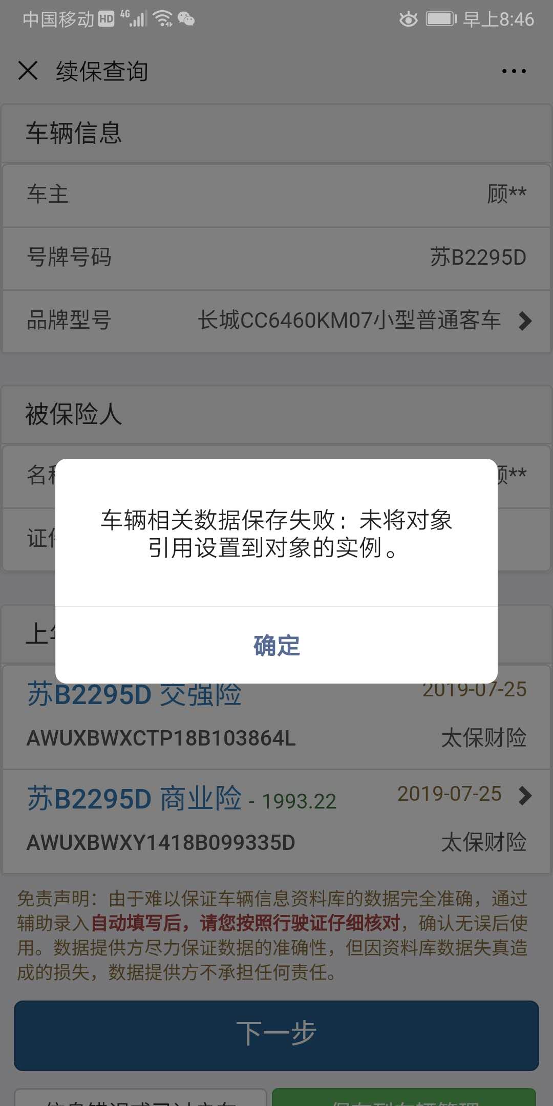 【江苏统一】报价时提示车辆相关数据保存失败:未将对象引用设置到对象实例。