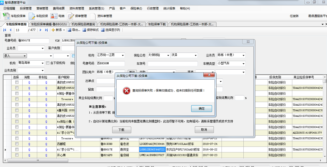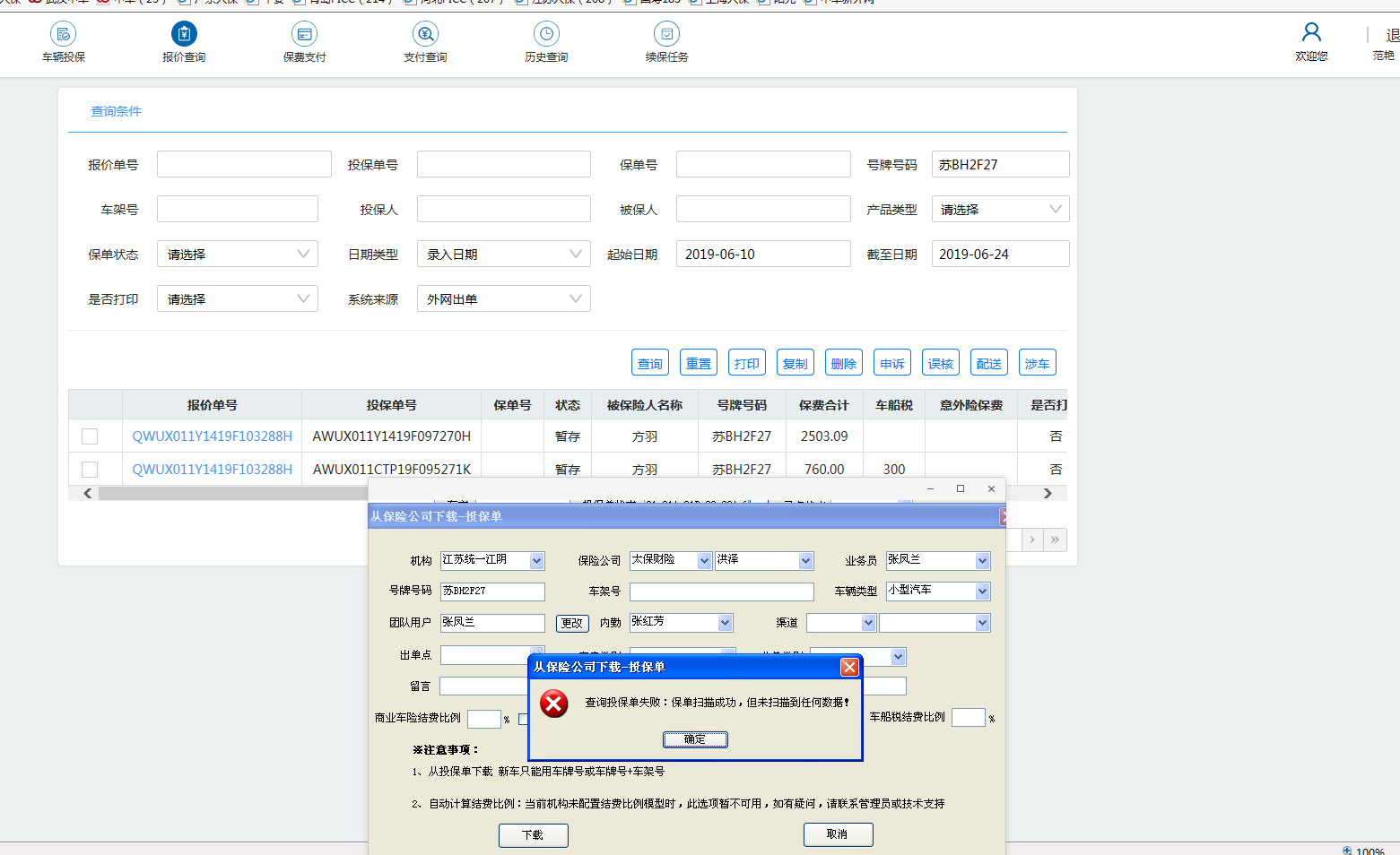 投保单下载时提示扫描成功但是未扫描到相应数据,保险公司系统中有相应的投保单数据,状态为暂存,相应提示信息见附件
