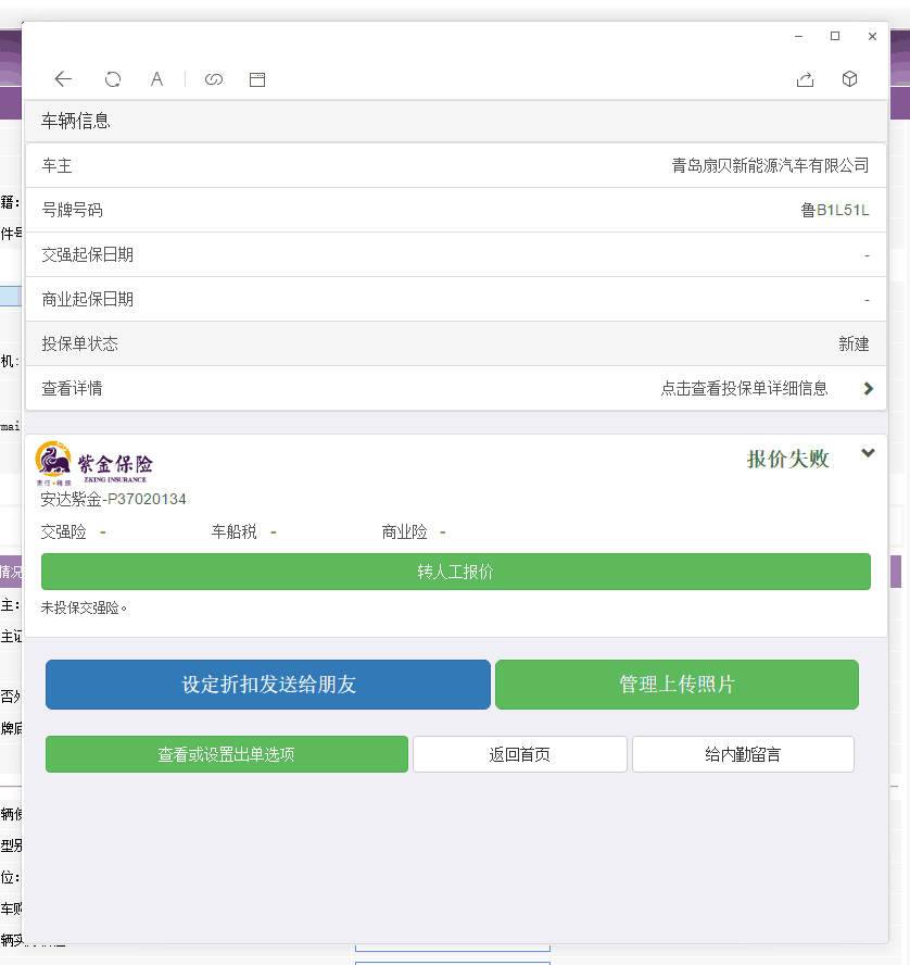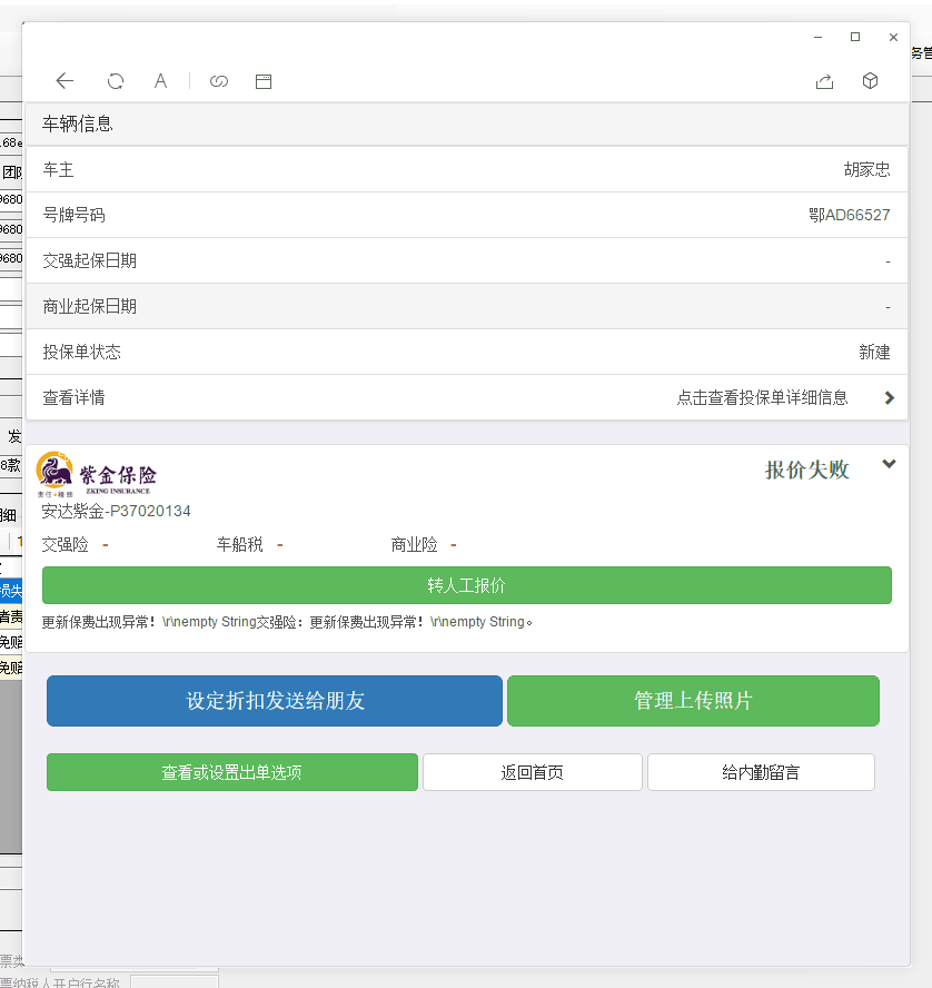 1. 测试车辆:鄂AD66527,报价失败提示异常。见附件2. 测试车辆:鲁B1L51L,报价失败,紫金系统可报价成功