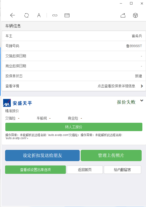 【青岛安达】安盛天平报价不稳定,出现“操作异常:未能解析此远程名称: 'auto.axatp.com'交强险:操作异常:未能解析此远程名称: 'auto.axatp.com'。”