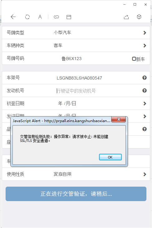 微信报价时无法通过交管验证提示交管信息检测失败:操作异常:请求被中止:未能创建SSL/TLS安全通道