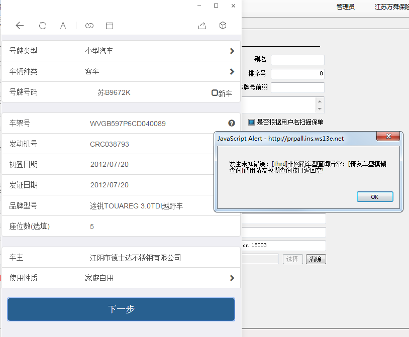 在保险公司系统中可以正常进行报价,此车为续保车苏B9672K 途锐TOUAREG 3.0TDI越野车