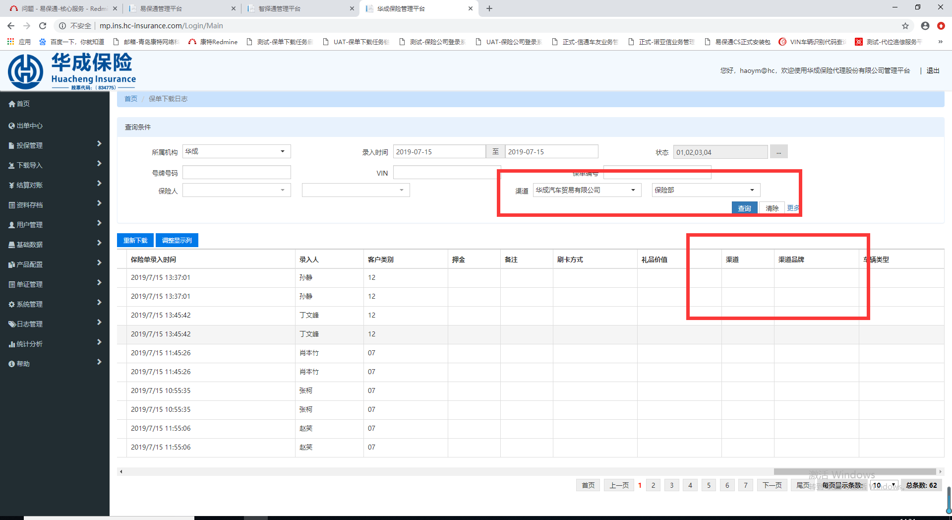 【保单下载日志】保单日志中不显示下载的渠道和渠道品牌,见附图