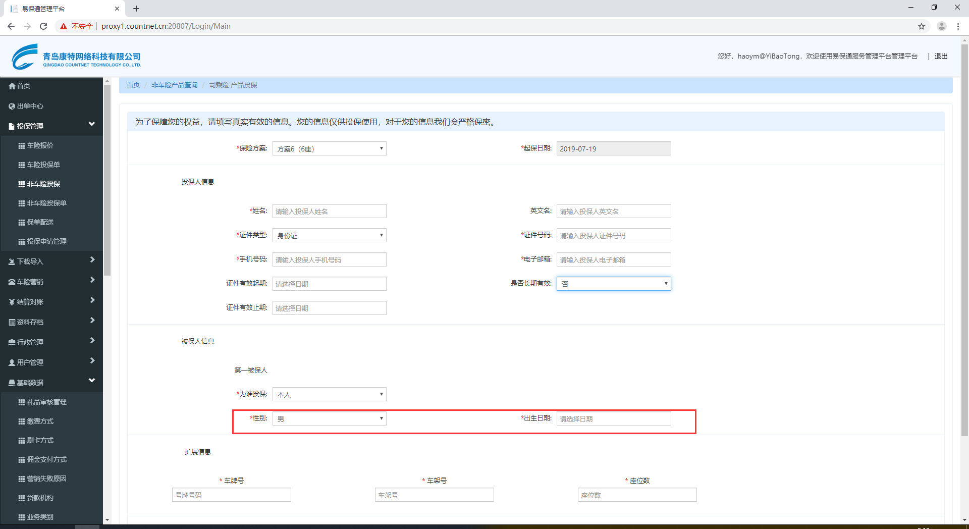 【测试环境】非车险投保,产品投保页面被保人信息选本人以外证件类型为身份证以外,弹出性别和出生日期两项,再将为谁投保选择本人,性别和出生日期依然显示在外面